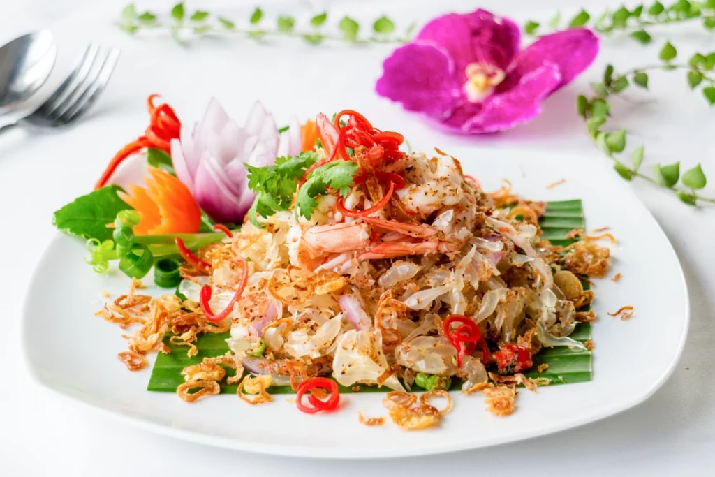 This is a popular seafood dish in Thailand that you can find both in side-type restaurants and high-end restaurants. Yum ruam mit talay is a made of mixed seafood, such as squid and prawns. It has tomato, sliced cucumber, white cabbage, jelly mushroom, Thai celery, spring onion, coriander root, and lime chilli dressing.